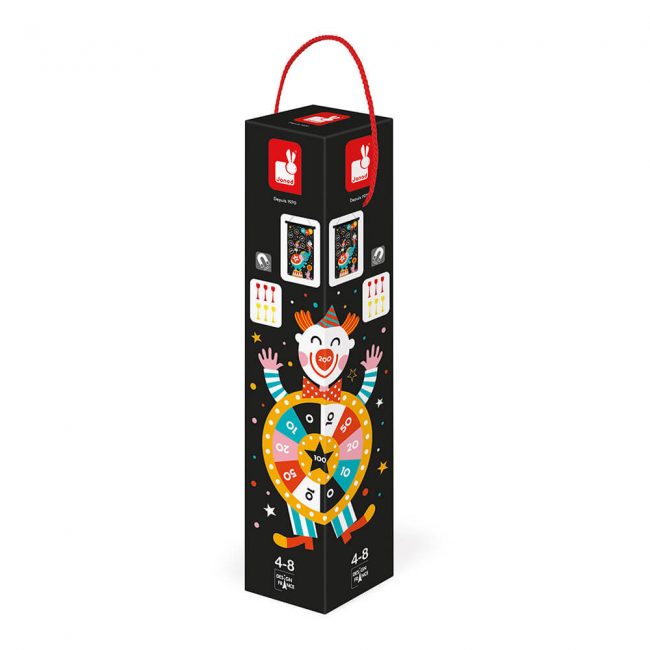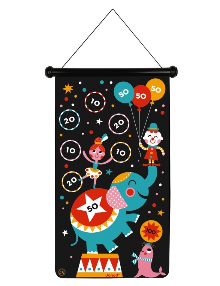 Podloga se lako stavlja na zid pomoću kanapa, a 6 strelica su magnetizovane radi veće sigurnosti. Više od zabave, ova igra je savršena za razvijanje motoričkih veštine i koncentracije deteta. Magnetna podloga sa printom na temu cirkusa. Isporučuje se sa 6 plastičnih strelica (3 crvene i 3 žute boje) i pamučnim kanapom da bi postavili podlogu na zid.