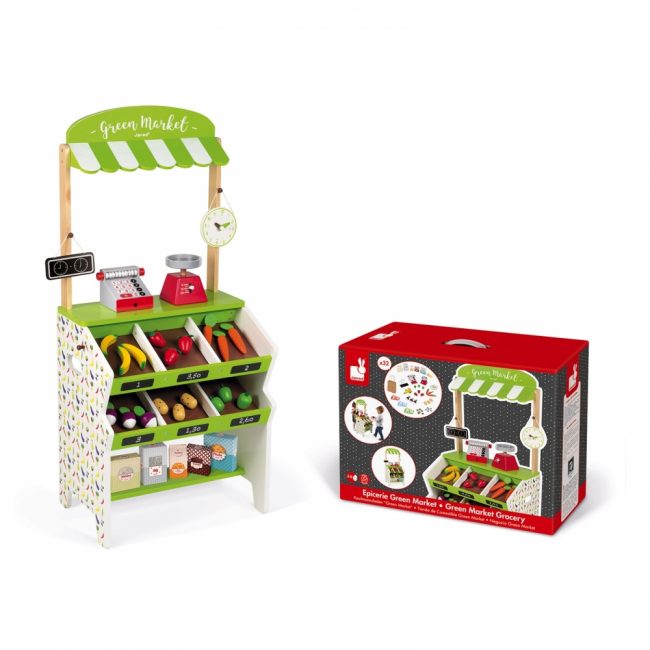 Predivni supermarket sa puno dodataka, idealan za ambiciozne male preduzetnike. Napravljena kompletno od drveta i bojena na bazi vodenih boja. Prodavnica dolazi sa gomilom dodataka: satom, pločom, kutijom kreda, šest kartonskih kutija za hranu, kasom, vagom, tri jabuke, tri banane, tri jagode, tri šargarepe, tri rotkve, tri krompira i tri papirne kese za kupovinu, ukupno 32 dodatna elementa. Dolazi u kutiji neasembliran.